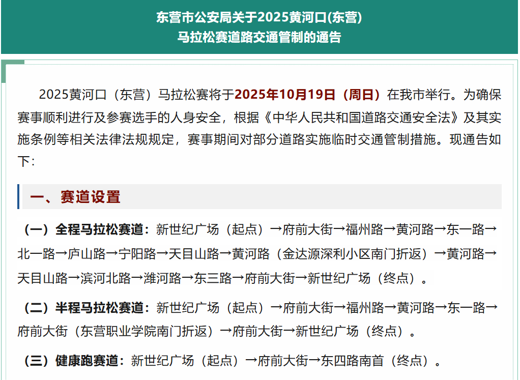 10月19日,2025黄河口(东营)马拉松赛开跑!这些路段交通管制