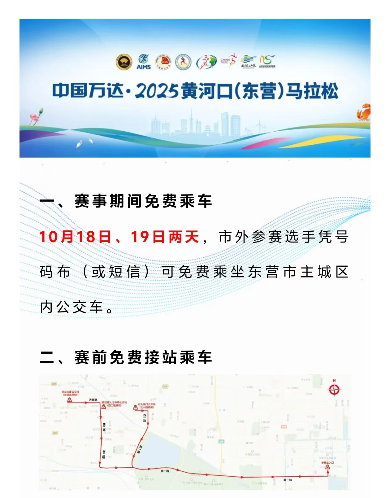 中国万达·2025黄河口(东营)马拉松赛事期间公交免费接驳方案来了。